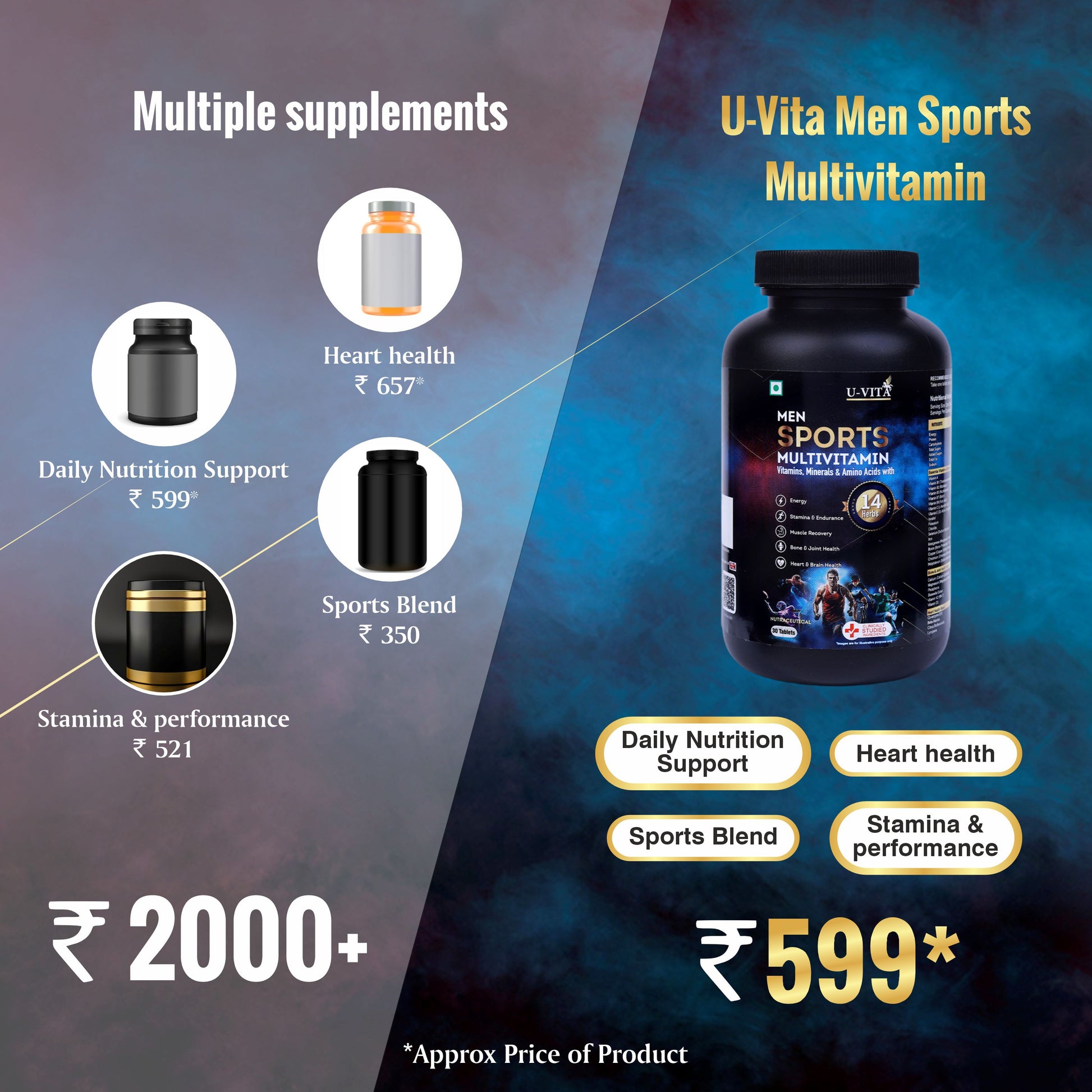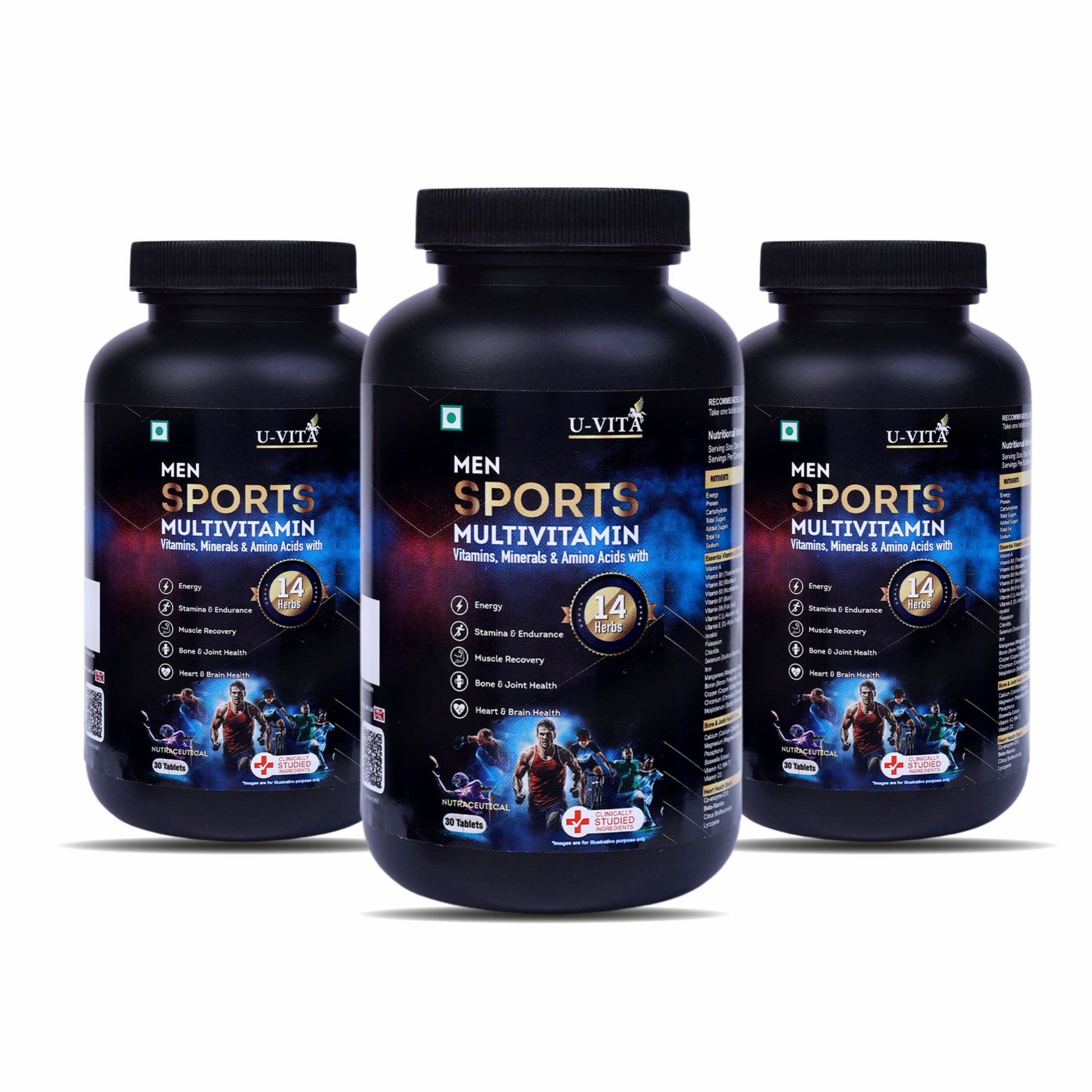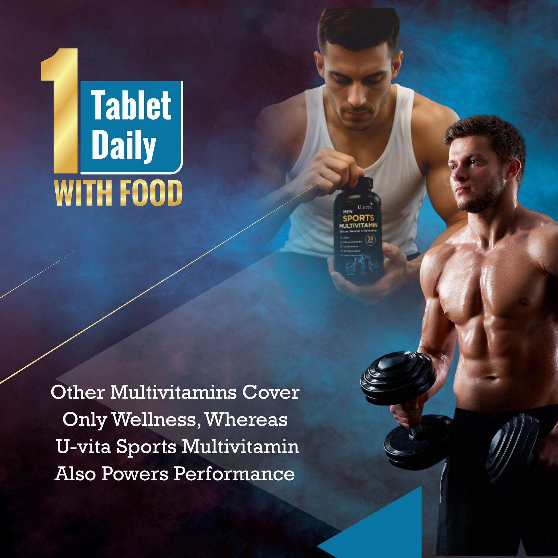 U-Vita Men’s Sports Multivitamin is a performance-driven daily formula designed to fuel energy, endurance, and recovery for active men. Packed with essential vitamins, minerals, amino acids, and herbal extracts, it supports stamina, muscle strength, heart health, and focus so you can train harder, recover faster, and stay at your best every day.