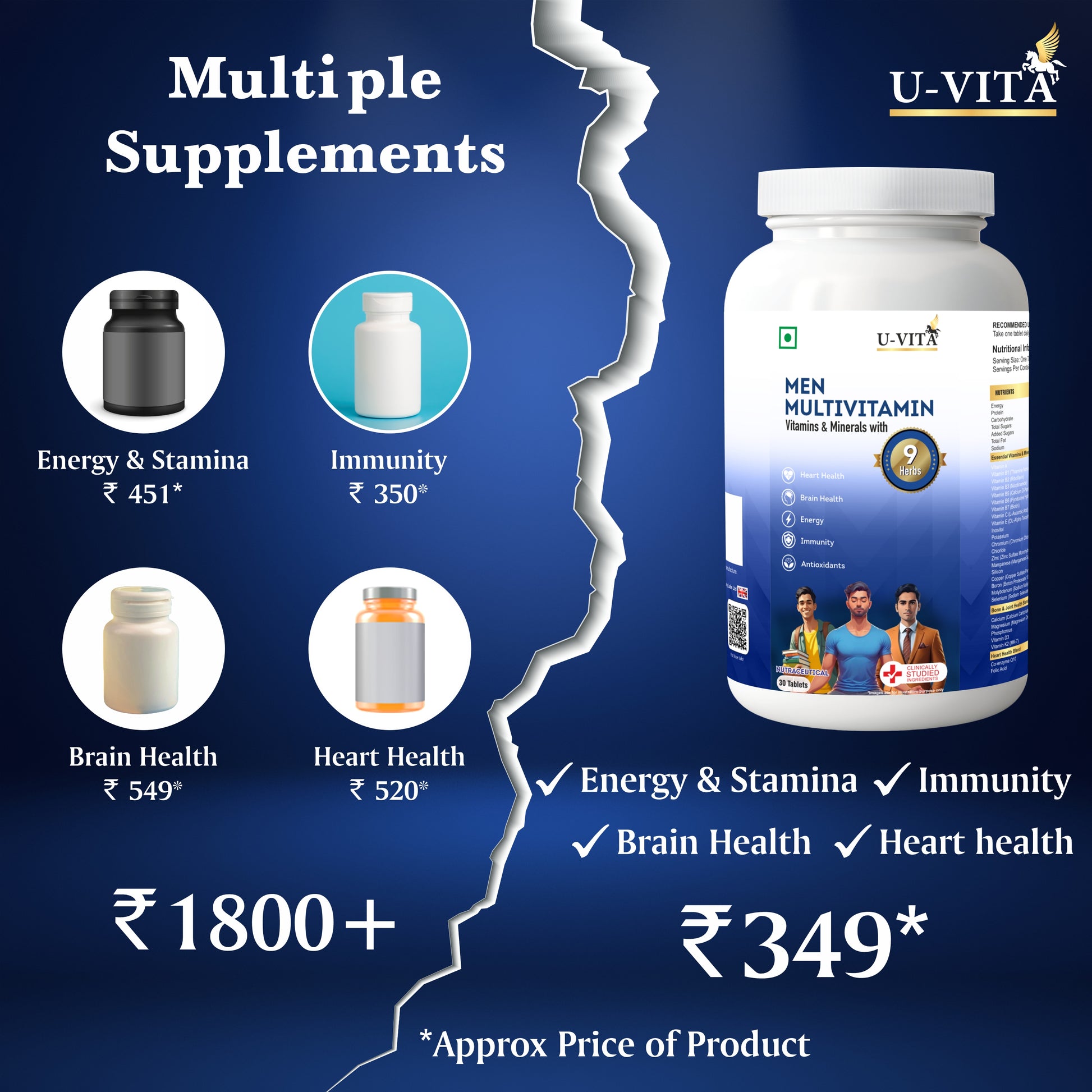 U-Vita Men’s Multivitamin is a complete daily formula designed to fuel energy, focus, and performance for men with active lifestyles. Enriched with CoQ10, Ashwagandha (KSM-66), Grape Seed Extract, and essential vitamins, it supports heart health, stamina, immunity, and mental clarity helping you stay strong, sharp, and resilient every day.