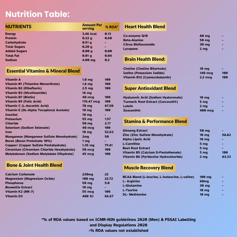 It combines essential vitamins, minerals, amino acids, and herbs to enhance performance and stamina.